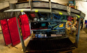 The structure of the submarine was drawn in Sketchup, and cut out on a Shopbot CNC machine. We then salvaged nearly everything you see on the submarine, from the LCD display, to the pipes, and the metal grating on the floor. The whole submarine rocks back and forth with an old hospital bed actuator.