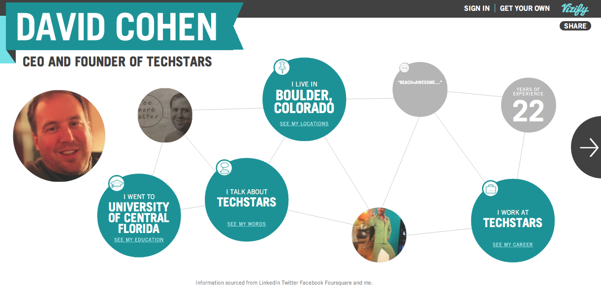 The new Vizify automatically sucks in data from your social networks to create that unified dossier, meaning that users simply create a profile (which only takes a few minutes) and connect their networks of choice, like Foursquare, LinkedIn, Facebook and Twitter. Boom! Vizify transforms that data into visuals as you continue connect your networks.