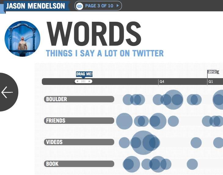 As you can see from the images above and below, the value proposition is the same as what’s behind single sign-on. Users get to have their social networking data piped into a central hub that refreshes itself to stay up to date. Instead of forcing people to slog through your twitter stream to see what you happen to be retweeting, one of Vizify’s pages in your visual resume is a dedicated, interactive graph of the words you tweet the most. It’s a great, quick way for visitors to get a sense for what subjects you’re passionate about.