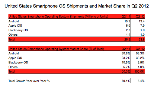 And in a mark of ongoing consolidation around two dominant players, “others” (including Windows Phone from Microsoft/Nokia and other OEMs,) declined sales of just 1 million units for the quarter for a 4% share of the market.