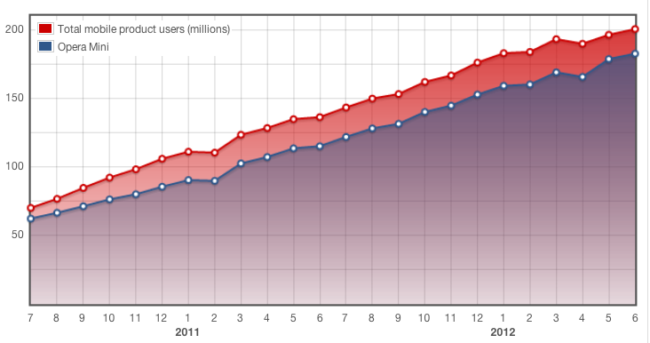 Opera notes that the 200 million active-user figure is a rise of 47% over June 2011, the same rate Opera reported last month but definitely down from growth in March 2012 — when Opera noted that users had been growing at a rate of 67% (the company had released a big update of Opera Mini at the end of February, which may have accounted for that spike). An Opera spokesperson tells me that the company does not release figures on the total number of downloads and inactive users.