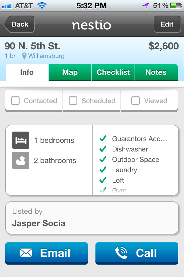 The Nestio app gives you a little bar where you can note if you’ve contacted the agent, scheduled an appointment and seen the apartment.