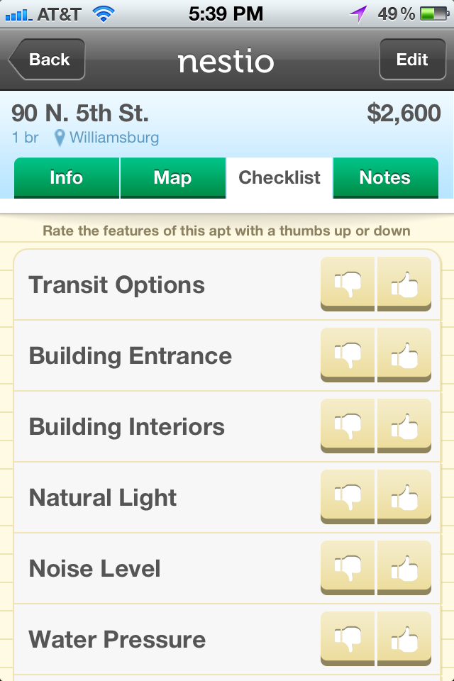 The update brings with it an apartment checklist for every listing, letting you “thumbs up” or “thumbs down” certain feature like transit options, natural light, water pressure, outlets, closet space, etc.