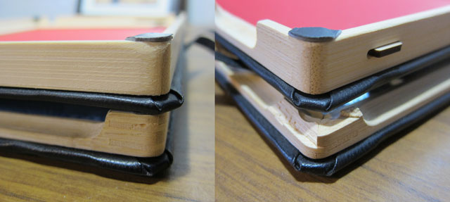 The redesigned case also brings more noticable changes. There’s now a hole in the back for the iPad’s camera. A little wooden faux button up top to engage the iPad’s lock button when pressed. Finally, the new case is a touch thicker, allowing it to better hold the thicker new iPad.