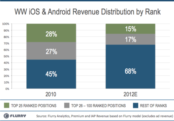 Drilling down into paid apps and in-app purchase revenue only (excluding ads), Flurry found that the distribution of revenue was spreading out across the long tail of mobile apps in a rather surprising way, which goes counter to the trends you’ll often see in other industries. In 2010, the top 25 ranked apps accounted for 28% of the revenue, the top 26-100 generated 27%, and the “long tail” was 45%. Now look at 2012: the long tail is responsible for 68% of the revenue generated, with the top 25 at 15% and the top 26-100 at 17%. (See chart below). That’s quite the shift.