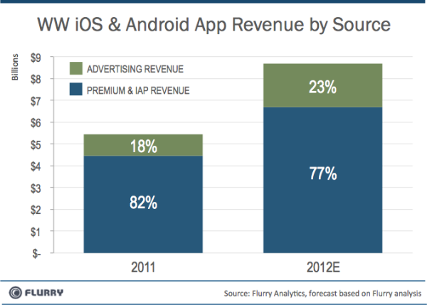 In 2011, revenue from premium (paid) apps and in-app purchases was 82% ($5.4 billion) of the total revenue generated, and ad revenue was 18%. In 2012, Flurry predicts revenue to grow by 60% to reach $8.7 billion, with ad revenue growth climbing by over 100%, going from $980 million in 2011 to $2 billion in 2012. That means that for this year, ad revenue will be 23% of the total, with paid apps and in-app purchases accounting for 77%.