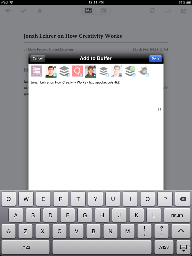 While Buffer could be shafted by Facebook (hmm where have I heard something like that today) if Facebook develops similar tools (and I really think they’re headed in that direction), the service looks pretty awesome and useful for now, so check it out and hope it doesn’t get acquired or killed. Or both!