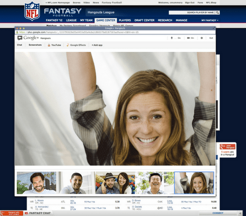 Google announced today a pretty major deal with the NFL which will help it to virally grow adoption of Google+ Hangouts – the live chat feature on its social networking efforts known as Google+. With a full rollout coming later this month, NFL.com will soon be offering one-click access to Google+ Hangouts, allowing fantasy football players to video chat with their league in real-time. This is big news not just for Google+ itself, but also for the NFL.com website, since it means that players from all over get to have the same experience of hosting live draft parties and meetups, even when they’re too far to travel back and forth between people’s houses.