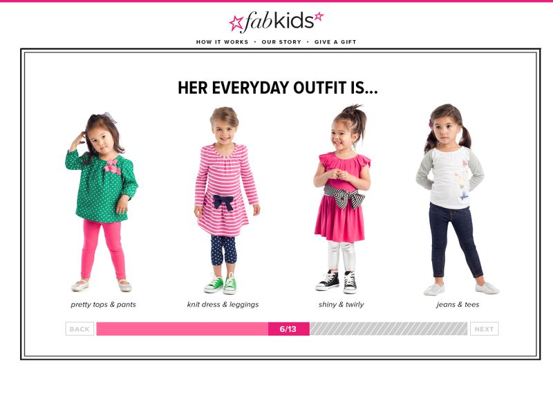 The company is starting out with a focus on girls’ clothes, sizes 2 through 8, but plans to expand in September to sizes 10 and 12, then to boys and infants in 2013. Taking a page from ShoeDazzle’s book (the personalized shopping service for shoes and handbags), FabKids steps parent and child through a sign-up process to determine what they like. The 15-question quiz, asks not only for name, age and gender, but also things like what’s the child’s favorite outfit, color, or pet. There are 100+ different outfit combinations available at launch that fit different “personality” types like princess, boho beach, fashionista, or even just jeans-and-tees.