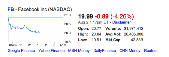 Today, Facebook hit a new milestone, perhaps one that it won’t be celebrating much: the stock went down past $20 a share. In fact, as this post is being written it’s trading at $19.99.