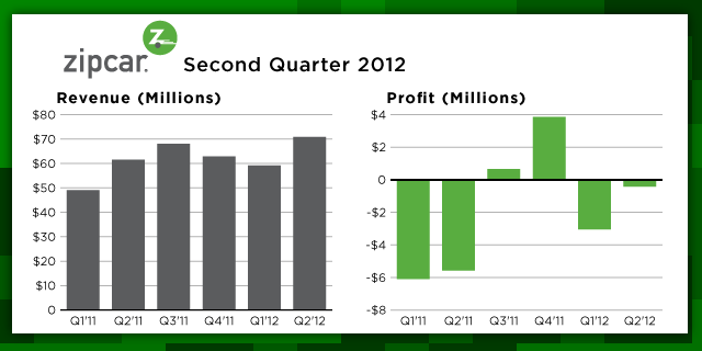 Zipcar is seeing increased competition in the car-sharing market, which is one reason that it might not be growing as quickly as it, or analysts, like. Zipcar reported second-quarter loss of $422,000 today, or $0.01 a share, compared to a net loss of $5.6 million, or $0.17 a share, in the prior year’s second quarter. The earnings came on revenues of $70.8 million, which is up 15 percent from $61.6 million in the second quarter 2011.