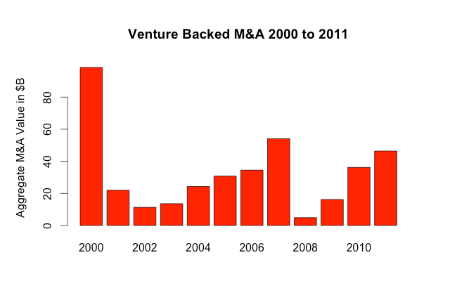 In 2011, venture backed M&A reached $46.4B, about twice the level of the ten year trailing median of $24B, a good indicator for the health of the fund raising market in 2012. But venture backed M&A proceeds in the first half of 2012 are 30% smaller than in 2011.