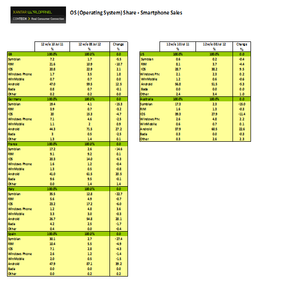 The story for Windows Phone is similar to that of iPhone and iOS, notes Kantar — that is, people appear to be holding off for Windows Phone 8 releases. That’s happening on a much smaller and more depressing scale, though. Windows Phone did not break through even 5% of sales in any market Kantar researched, as you can see in the full tables below. And just as RIM has a (sort of) break out market in the form of the UK, Symbian is still seeing a bit of life in Italy, where it accounted for 12.8% of sales, although that is a decline of more than 22 percentage points on last year.