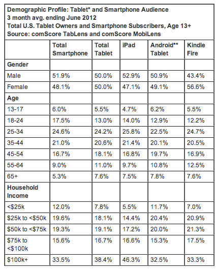 The tablet market is still relatively young, with penetration in the fast-forward U.S. market only reaching 47% by 2013, but we are already starting to see some usage patterns emerging, according to comScore. In a survey of 6,000 tablet owners in the U.S., the researchers have found the Kindle Fire has more female than male users while iPad skews to males. It also found that Apple’s tablet has the highest satisfaction ratings of all tablets — although across iPad, Android and Kindle Fire tablets, all rate relatively close to each other, and all of them are higher than the average satisfaction ratings for smartphones.