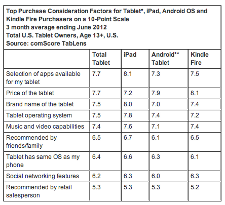 Turning to what gets users to buy tablets, comScore found that on average apps availability and price are just as important as each other to consumers. (That should quiet those who say apps are secondary to the web.) That result varied among different categories — for example the more expensive but app-tastic iPad scored higher for apps than the largely cheaper Android and Kindle Fire tablets. It seems to indicate that if Apple did launch a cheaper device but with most of the same functionality, it could potentially blow all the others out of the water.