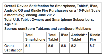 Lastly, in the area of device satisfaction, Apple’s iPad, the most popular tablet in the market today, scored the very highest. But not with as wide a margin as you would assume, given its market share. Apple had an 8.8 on a scale of 1-10, but the Kindle Fire was nearly as good with an 8.7 rating. Interestingly the un-forked Android tablets scored the lowest at 8.2, but that category will contain a very wide range of models. Similarly, the catch-all category of smartphones also showed a comparatively low score of 8.1.