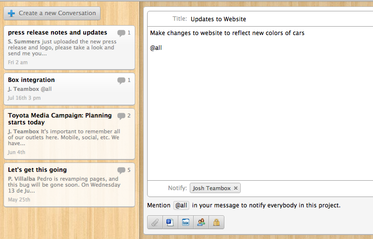 Teambox roots as a task management system is evident in its chat feature, which allows end users to quickly create conversations between teams to assign tasks and due dates to projects enabling real-time collaboration.