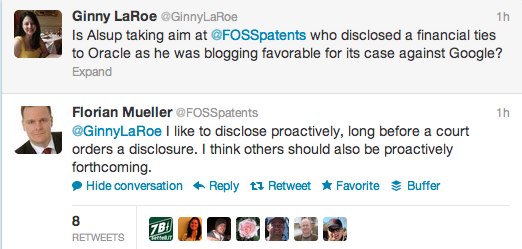 The controversy is enveloping Florian Mueller, one of the more incendiary bloggers on the topic of open source and patent law. Mueller has been covering the trial. He recently stated that Oracle is paying him as a consultant. His posts, surprise, have been very much in favor of Oracle’s arguments.