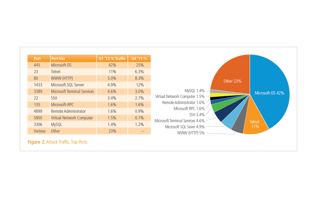 Attack traffic by ports points to Conficker Worm rising again: Akamai notes that Port 445, used for Microsoft-DS, accounted for a disproportionate 42% of all attack traffic, up from 25% in the previous quarter. It notes that Port 445 is associated with the Conficker worm.