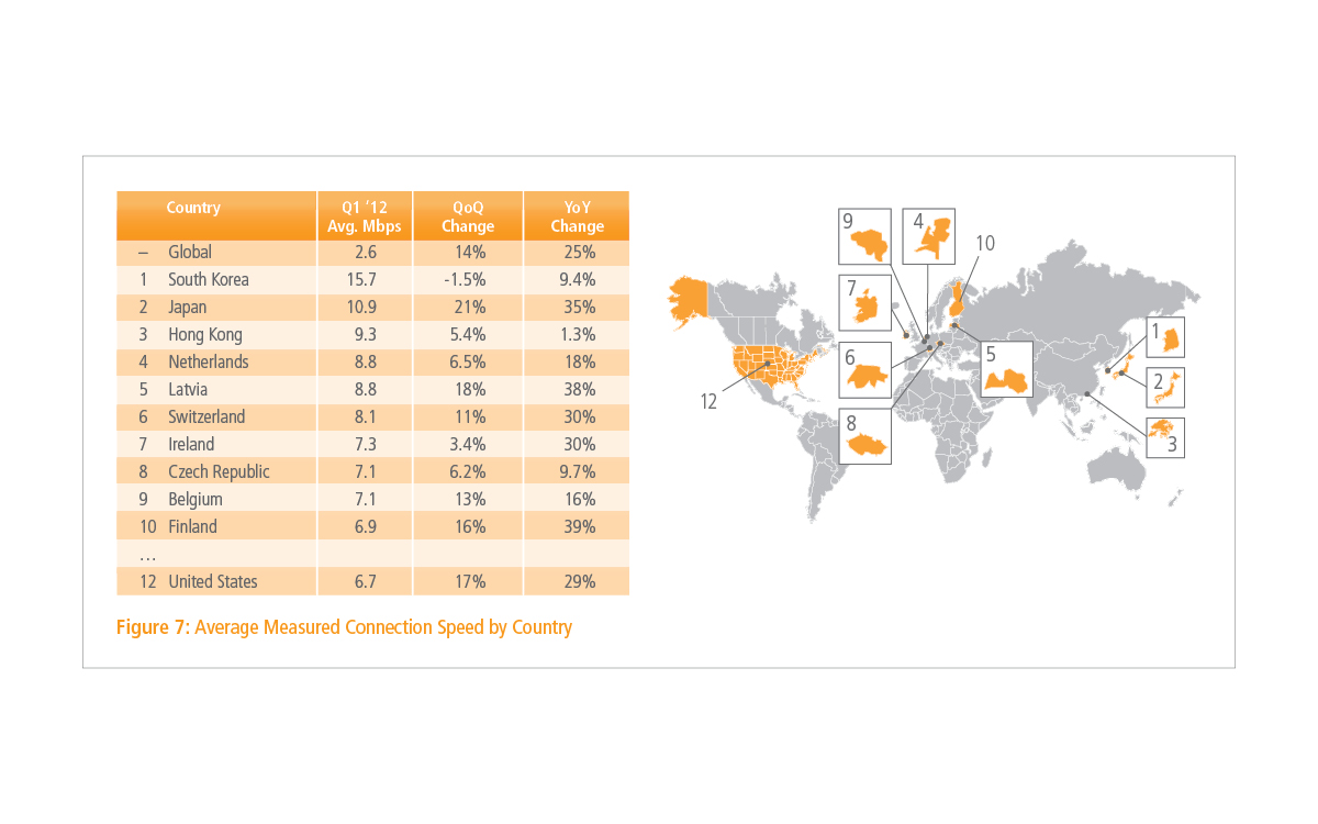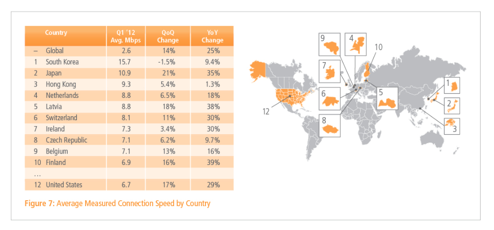 Globally, the speed for broadband connections is steadily on the rise: according to Akamai’s Q1 2012 State of the Internet report, it’s now at 2.6Mbps, compared to 2.3Mbps in the last quarter, and a rise of 25% on a year ago and a reversal of the 14% decline of last quarter. South Korea continues to remain the connection king, with an average connection speed of 15.7Mbps. The U.S., meanwhile, doesn’t make it into the top-10 countries (it’s ranked 12th) but at least it’s speeding up: it is now at 6.7Mbps, up by 29% on last year and 17% from the previous quarter.