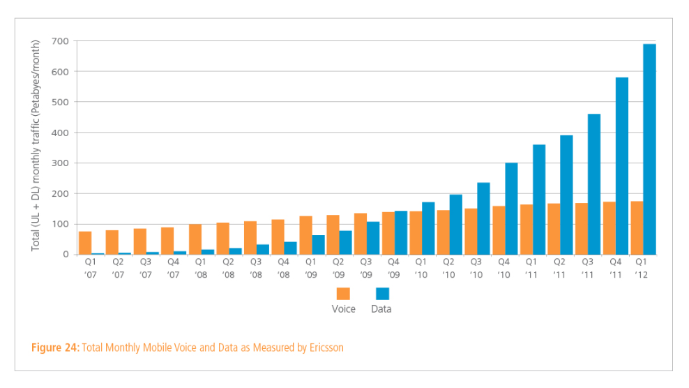 As for how we are using mobile broadband, this graphic that Akamai presents of the last five years shows just how much data is growing with respect to voice usage: