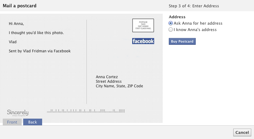Mail A Postcard is a partnership with Sincerely, makers of Postagram, which lets you send your Instagrams through snailmail. That service is only $0.99 per card, so Facebook might be aiming at a similar price or a little higher to net it a margin. The deal could bring tons of visibility to Sincerely, which also offers photo apps Popbooth and Dotti.
