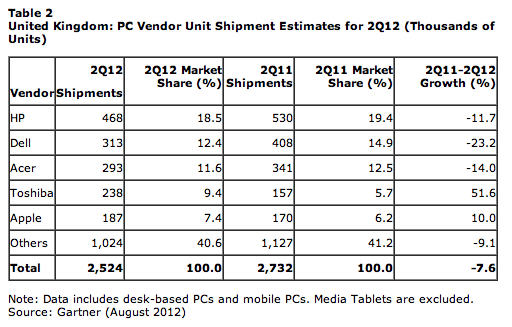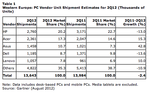 Tablets and smartphones may be gradually ushering us into a post-PC world, but for now the bigger machines continue to dominate the market. Figures out today from Gartner, focusing on PCs in Europe, note that shipments in the economically-troubled region declined by 2.4% to 13.6 million units in Q2, in a wider global market where growth was flat. Within that, HP kept its lead as the biggest PC maker, while Apple has managed to crack into the top-five PC makers in one market, the UK.