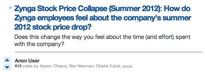 The last line refers to a previous Quora answer that describes the stock drop as devastating. There’s definitely conflicting opinions, though. One response from a 4-year Zynga employee said the company is “far from perfect” but that this story could be a “gross exaggeration”, and concluded that, “‘Devastated’ is a bit too dramatic…disappointed seems more fitting.” Now Bloomberg reports that Zynga will hand out more stock to employees to compensate them for the flubbed IPO.