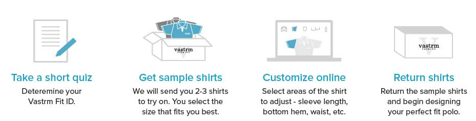 You can go on Vastrm’s site and take a short quiz, entering height, weight, body type and waist size, to “optimize size selection.” Vastrm has an algorithm that recommends 2-3 of their fit types (slim, sport and relaxed) to suit your body type. The company then ships you a few sample polos for free to try on.