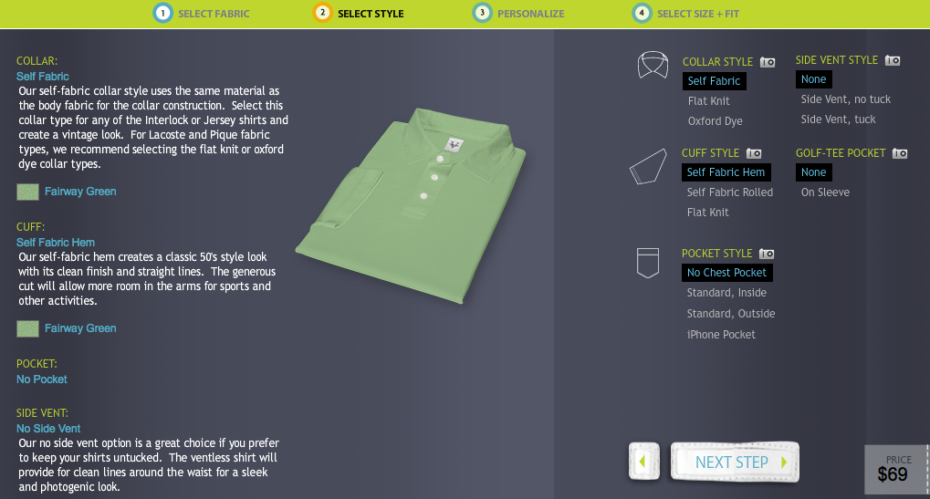 You can then select the fabric and different styles for the collar, cuff, pocket, vent, buttons and even an optional golf tee pocket. After you finalize your order, you’ll get your customized polo in about three weeks.