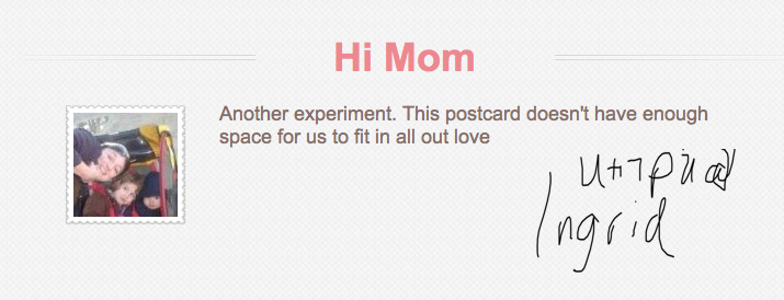 So I was especially excited to hear about HiMom, a YC-backed mobile app, part of the current class, that lets you create postcards from pictures you’ve taken on your phone, and then send them to your parents — or anyone else you’d like to keep in touch with on a regular basis. To me, it seemed like the perfect union: it takes something I am already doing to record and create things (using my phone) and matches it up with how my parents like to get their content (in a physical form).