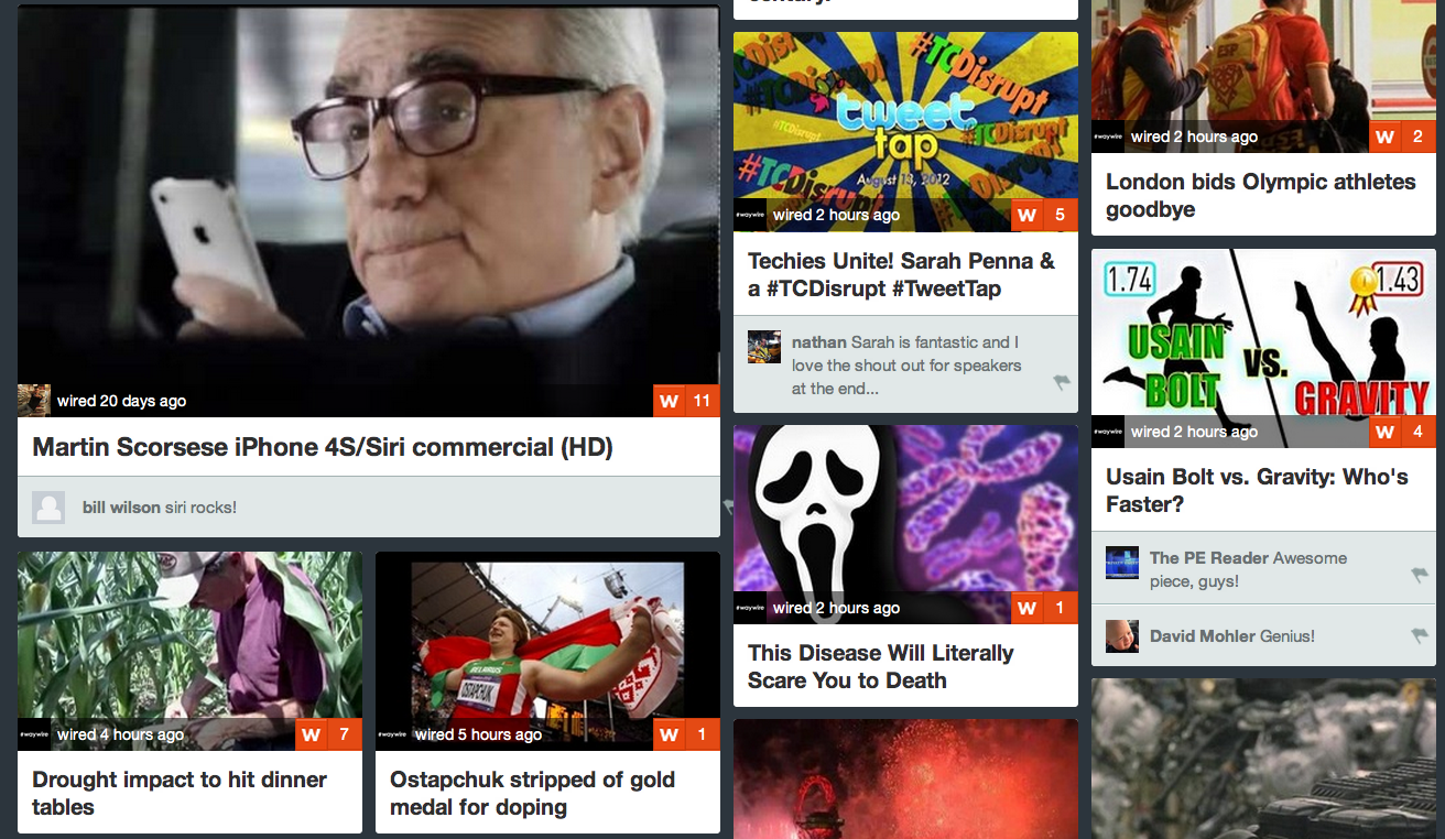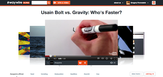 You can sign up for #waywire with just an email address, but then can connect your Facebook, Twitter, Google+, or LinkedIn to “wire” out the videos you choose. The homepage of #waywire is a Pinterest-style board of personalized video suggestion, which rests below a carousel of editorially curated top picks. From here, users can browse an eclectic set of topics, from The Olympics to world news.