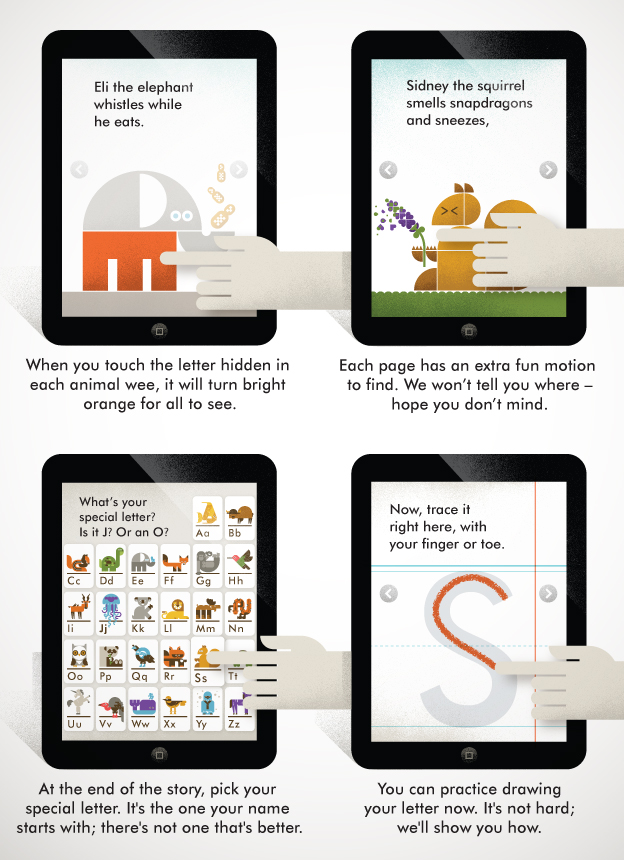 Wee A B See itself is an adorable interactive book that uses animals, sounds, and letter drawing practice to teach preschoolers the ABC’s. It’s reminiscent of the Interactive Alphabet app, if you had to pin it down. But the app is not the only plan Wee Society has for the cast of characters they’ve invented here. The team is also going to sell prints and posters on their website (which is still under wraps here), and maybe even expand into other wall hangings and books. The posters will range from affordable ($45) to expensive ($250), and some will be able to be personalized with the child’s name for $85.