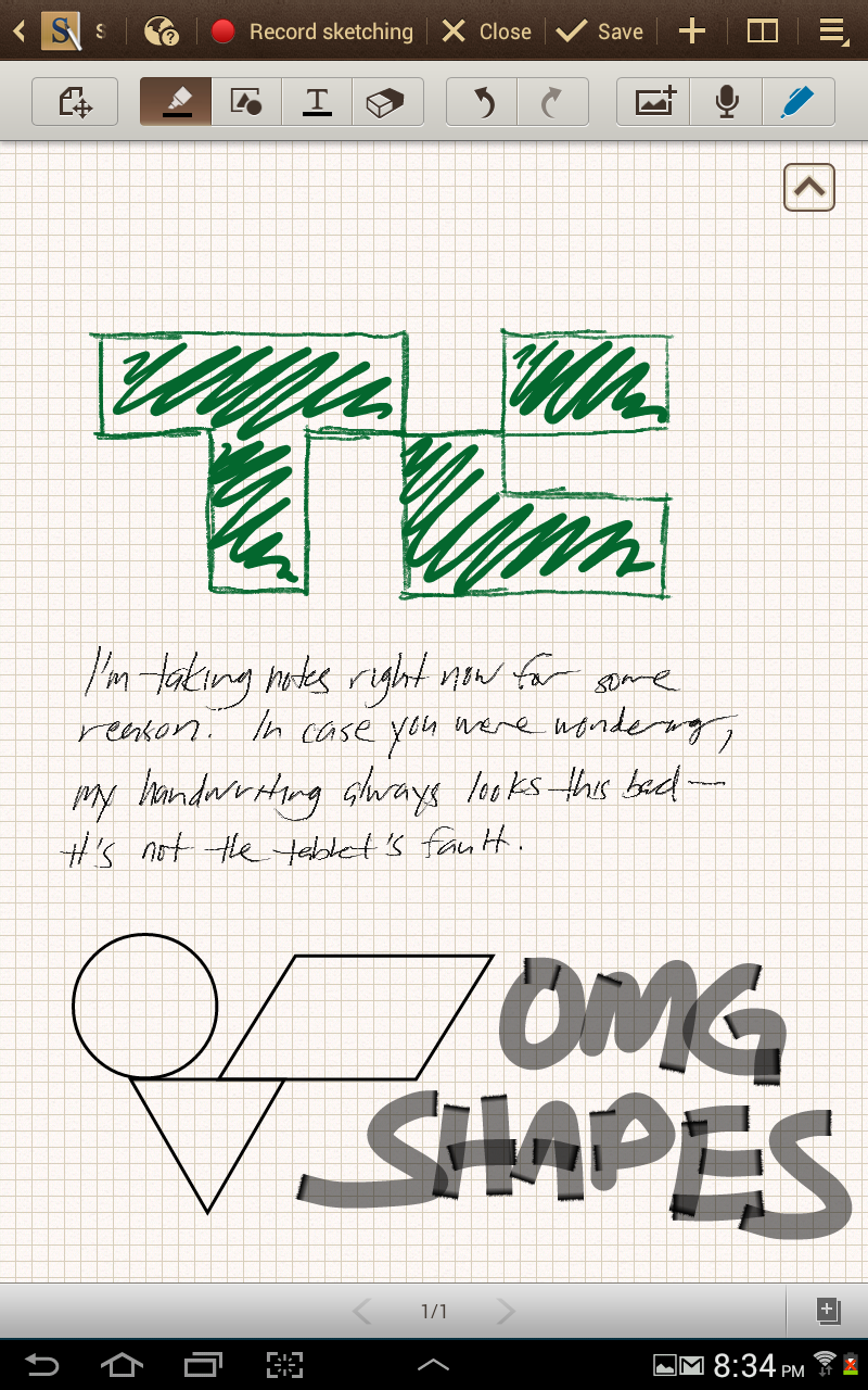 One major improvement came about because of the Note 10.1’s larger screen — it hard to avoid resting one’s wrist on that sizable display while writing or doodling, and thankfully the tab’s palm detection functionality works like a charm… most of the time. It’s the sort of issue that depends on the app being used at that particular moment, and some of them just aren’t are smart as others. Samsung’s own pen-friendly apps (S Memo) never seems to struggle with ignoring a user’s hand, but apps like the pre-loaded Photoshop Touch often left me wondering why my sketches weren’t taking shape until I physically lifted my hand off the screen. Thankfully, incidents like that were few and far between.