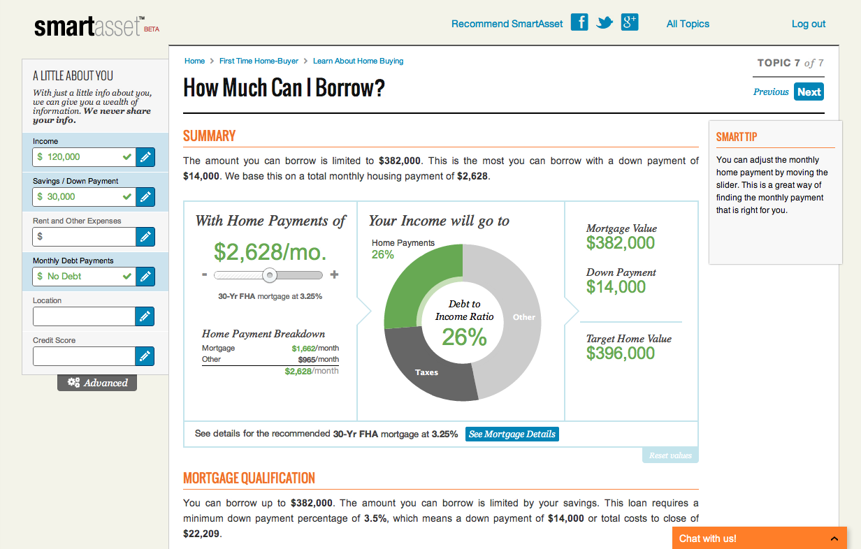 When users come to SmartAsset, they enter their basic financial information, then interact with a number of calculators and charts that help them understand the financial implications of their homebuying choices. The site will recommend a home price that they can afford, provide a graph modeling the rent vs. buy decision, and suggests things that might save users money. The point is to help users perform their own analysis, so they don’t have to follow SmartAsset’s recommendations blindly — for example, if you want to buy a home with a higher price than the one suggested by the site, you can enter that price and the company will show you how that’s likely to affect your finances.