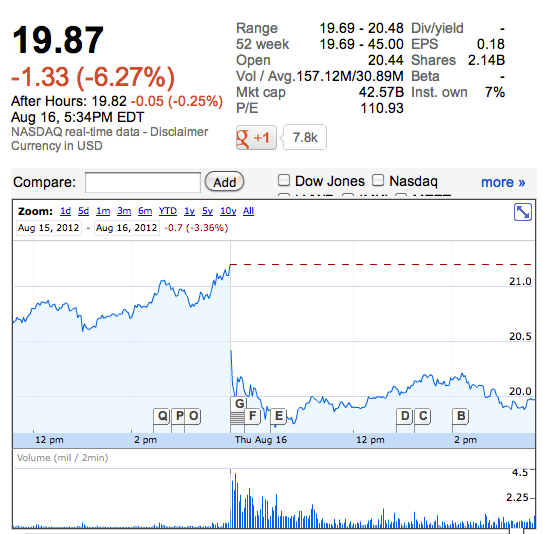 Facebook warned the market yesterday that there would be a downturn today. Today marks the first lockup expiration of Facebook’s gradual release of shares. Accel reportedly distributed a big portion of its stake to limited partners who then sold, and Facebook still has to endure the November expiration when long-time employees gain the freedom to sell.
