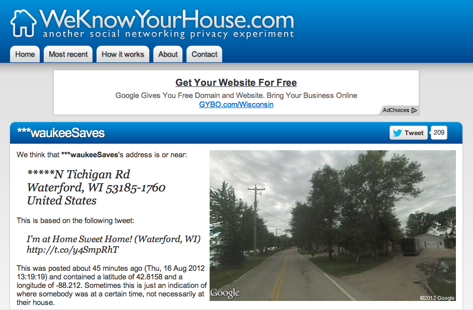 The site first started making the rounds on Monday, when outlets like Cnet and security blogs like Sophos detailed what was going on. According to the We Know Your House’s FAQ, the site uses the Twitter Search API to collect information (here’s an example query), and then pulls out the tweets which contain geolocation data. This data is provided in latitude and longitude format, which We Know Your House then converts to human readable street addresses.