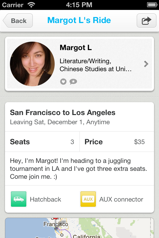 For those unfamiliar, the YC-backed startup brings people together for long-distance road trips (which they define as those trips over 50 miles), allowing drivers to “sell” their extra seats to riders for cheap. Now that it has 3K active rides listed at any given time and some money in the bank, the startup is looking to expose its ride-sharing experience to a new audience with the launch of a new iPhone app.