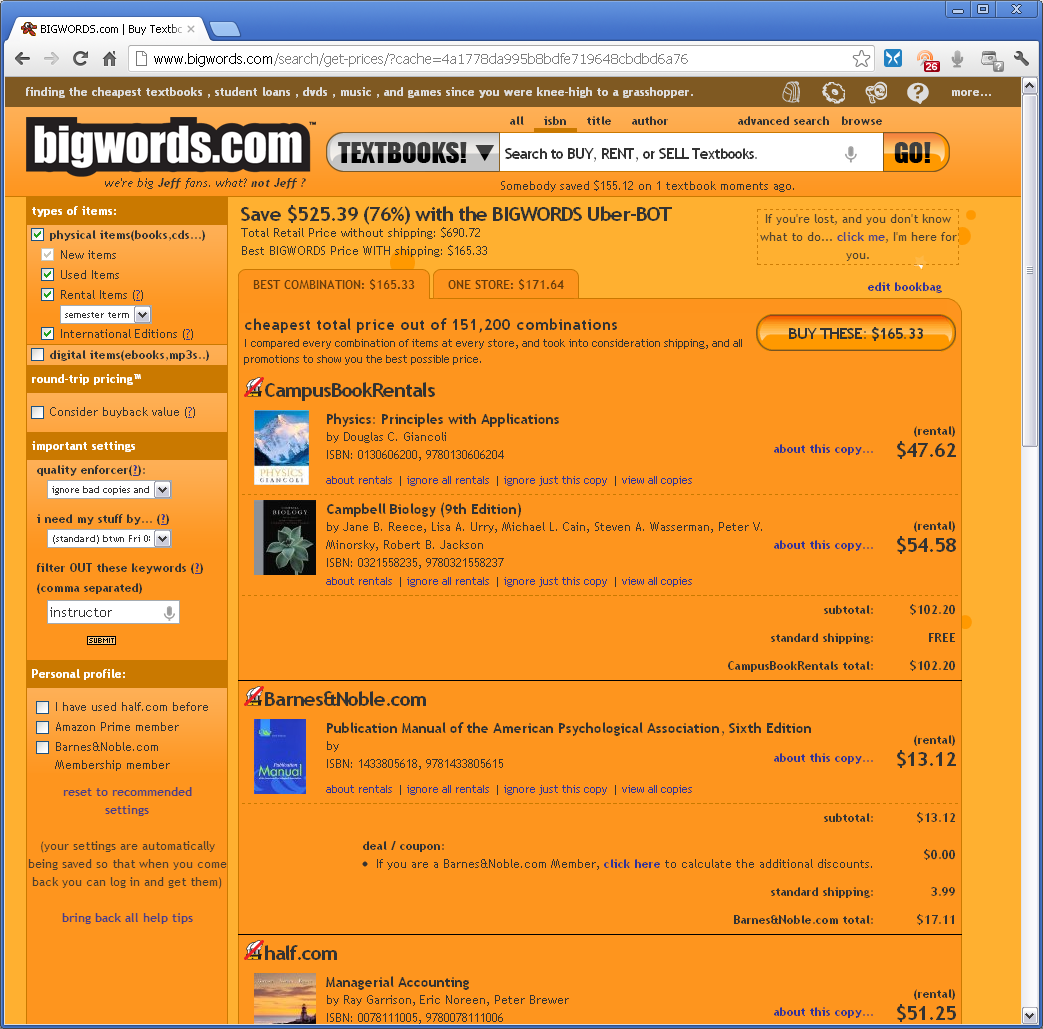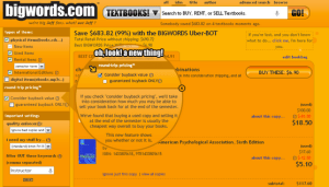 Behind tuition and room and board, textbooks represent the largest source of costs today for college students. But anyone who’s searched for textbooks knows that the cheapest source for one textbook may not be the best place for another, so now gives students the ability to pick and choose, automatically finding the right permutation. Students can select four books, putting them in their shopping cart.