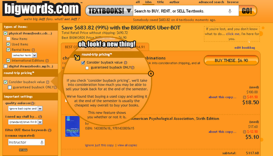 However, the company did run a survey of all the top sites in January and found that students ended up paying less in aggregate when they bought textbooks and sold them back, rather than renting them. So the company just launched a “Considered Buyback” tool, which users can turn on with each search. The tool takes the price of the used copies and subtracts how much they would be able to get for selling it back and compares that on each of its affiliate sites.