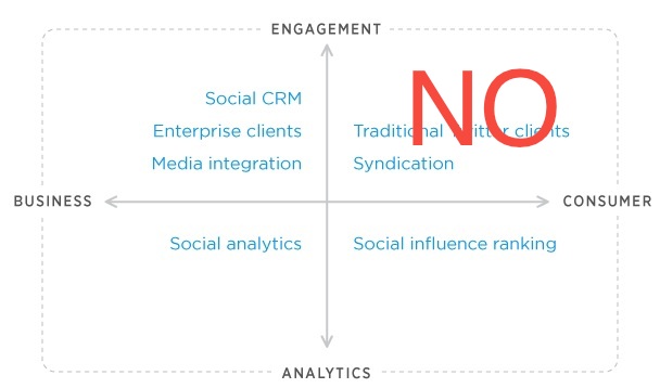 Why all the new restrictions? Well, it sounds like Twitter isn’t really interested in supporting services that compete with its own client apps. That’s something the company has said before, and it’s something Sippey basically says again in the blog post, accompanied by a handy-dandy chart, which I’ve included at the top of this post. (Uh, the red letters are my addition.) If you’re in upper left, lower left, and lower right quadrants, you’re groovy. If you’re in the top right … not so much. Or at least, Sippey says the company is trying to “limit certain use cases” in that area. He writes: