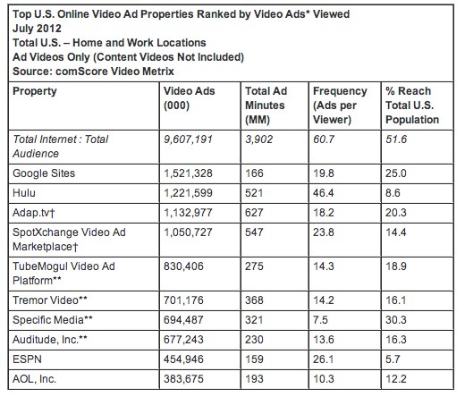 In terms of ads, Google ranked first with 1.5 billion ads, followed by Hulu with 1.2 billion, Adap.tv with 1.1 billion, SpotXchange Video Ad Marketplace with 1 billion and TubeMogul Video Ad Platform with 830 million. Time spent watching video ads totaled 3.9 billion minutes, with Adap.tv delivering the highest duration of video ads at 627 million minutes. Video ads reached 52 percent of the total U.S. population an average of 61 times during the month. Hulu delivered the highest frequency of video ads to its viewers with an average of 46, while ESPN delivered an average of 26 ads per viewer.