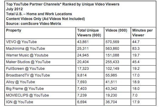 Drilling down on YouTube partner data, VEVO had 43.9 million viewers on July followed by gaming channel Machinima, with 25.3 million viewers. Warner Music and Maker Studios saw 24.9 million viewers and 20.4 million viewers, respectively. This is the first time Machinima, which just raised new funding led by Google, has taken the second spot in the partner rankings. Among the top 10 YouTube partners, Machinima demonstrated the highest engagement (83 minutes per viewer) followed by Maker Studios (45 minutes per viewer). VEVO streamed the greatest number of videos (571 million), followed by Machinima (564 million).
