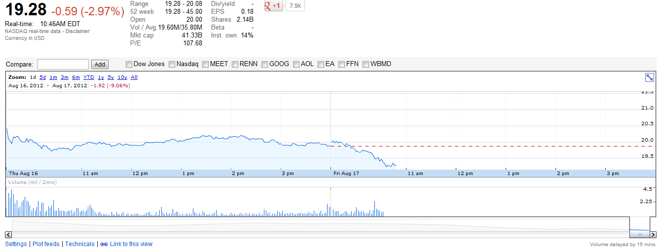 As of this post’s writing, a mere hour after the market opened, Facebook is trading around 19.25 a share. This is a far cry from the stock’s IPO price of $42 back in May. Worse yet, at least for the initial investors, the downward trend doesn’t seem to be slowing.