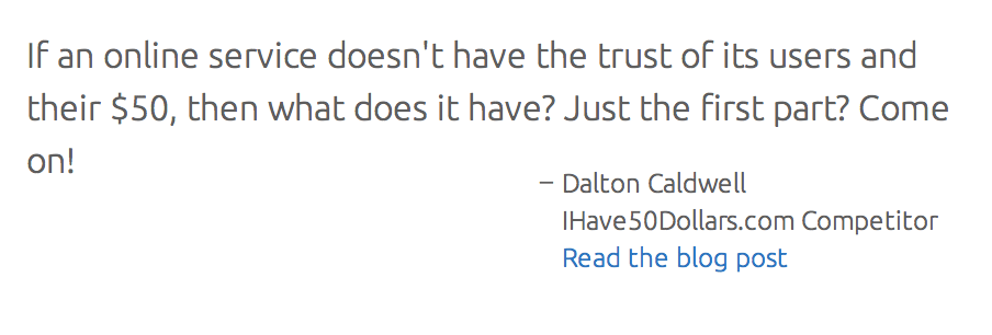 But remember that some real luminaries supported the cause. Marco Arment notes that “Like all of the other smart people (who have $50), I backed IHave50Dollars.com” and Scoble opines (not really) “You know, for $50, what’s another username?” With guys like that on your side, who can be against you?