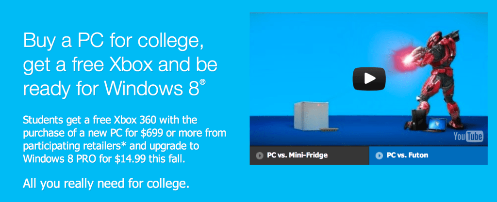 Student buyers who spend $699 on a PC will get the Xbox and the upgrade if they supply a student ID. Given that many PC shoppers are holding off until Windows 8 is official, this seems like a good move. Grabbing an Xbox and an inexpensive upgrade ensures that the laptops now mouldering in inventory are sold while Microsoft gains another revenue stream thanks to game purchases and Xbox Live subscriptions. Buyers, in turn, get some state of the art hardware that’s Win8 ready when it’s time to move over.