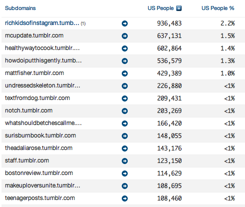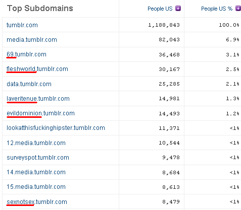 One thing that seems clear to me is that Tumblr has grown massively in the last couple of years. Taking the top 15 or so subdomains on Tumblr today and comparing them with the top 15 from three years ago, you can see how non-porn content has crowded out porn sites from the top rankings.