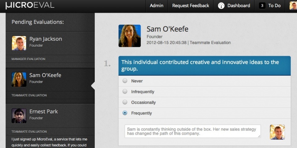 MicroEval says it’s created software to bring the employee performance review process into the web-focused era. “Everyone hates performance reviews, but every company does them, and spends tons of money and time on performance reviews every year,” co-founder Samantha O’Keefe said in her presentation (in the tech space, at least, that is certainly true.)