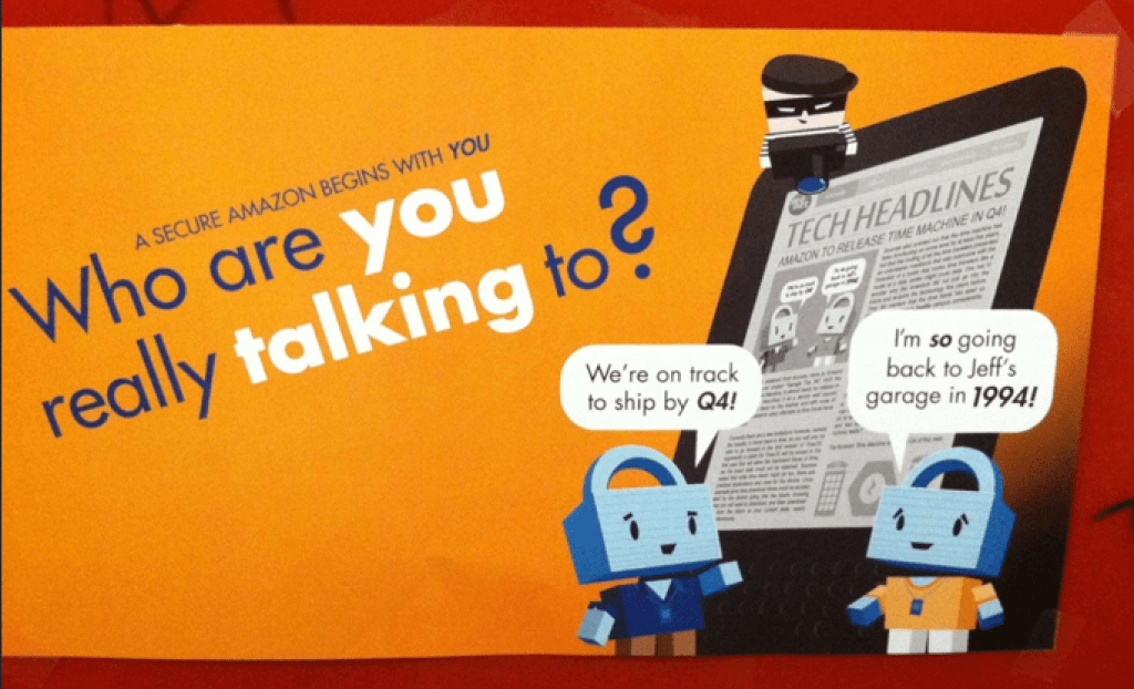 Somebody at Amazon in Seattle just texted us a pic of this weird propaganda poster, posted in an elevator at Headquarters: A SECURE AMAZON BEGINS WITH YOU.