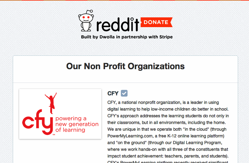 Already, there are several causes which reddit users can support via the new Dwolla-powered buttons, including Doctors without Boarders, DonorsChoose.org, Charity: Water, FCancer, Girls Who Code, and more. The Dwolla option was also built using technology from Stripe, the maker of a payments system for developers. With reddit Donate, the focus is more on non-profit fundraising, as you can tell by the line-up of supported charities. Specifically, the groups which reddit Donate supports are limited to those with 501(c)(3) status. (More details on the requirements are on reddit’s own blog.)